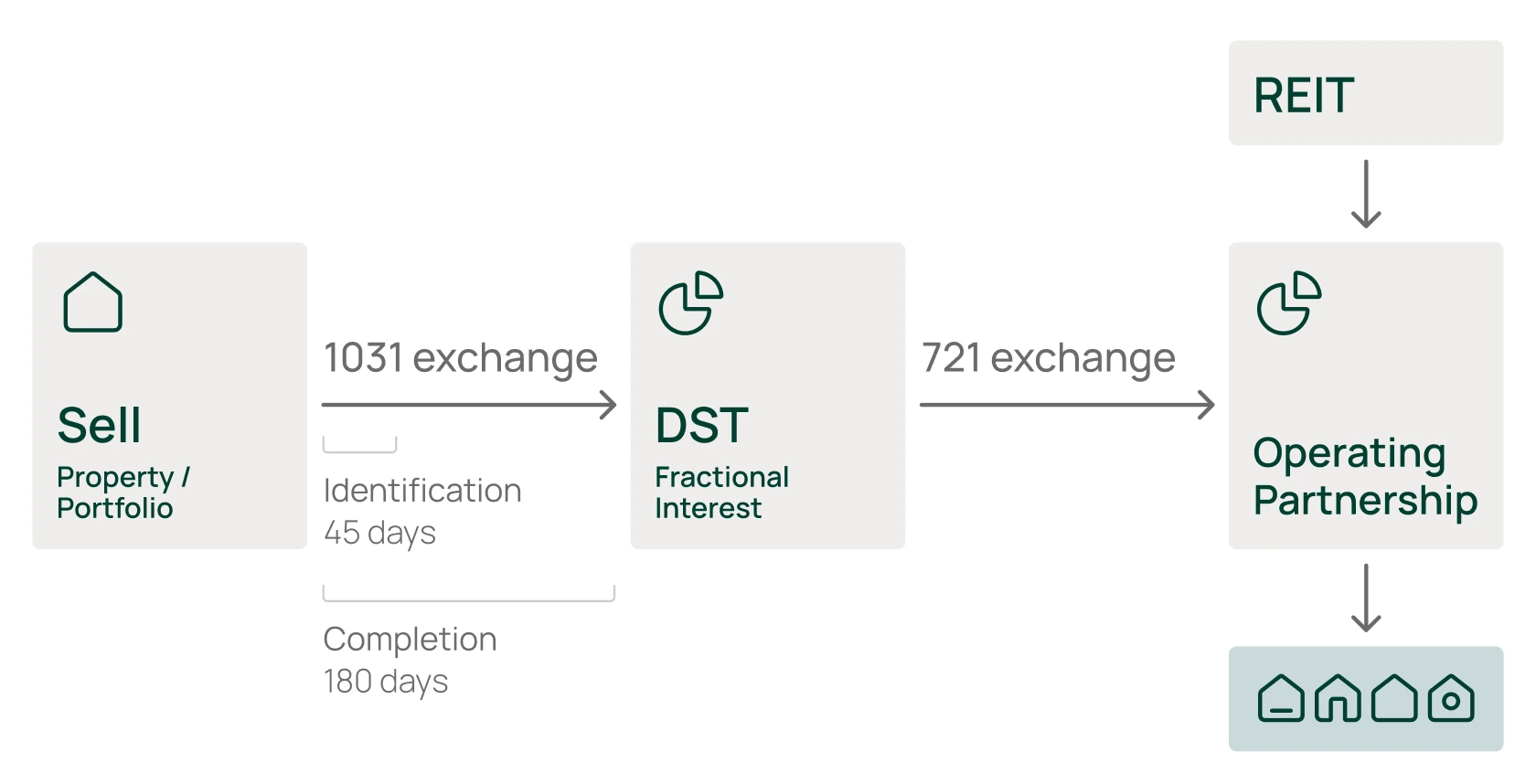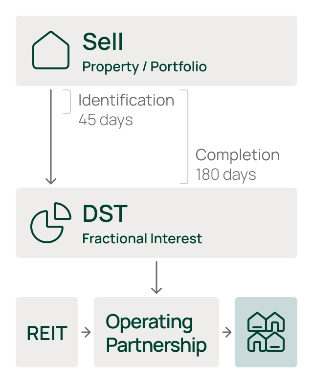 While the Flock Fund is often the most seamless and tax-efficient option for rental properties, it isn’t the right fit for every asset. For properties that don’t meet our acquisition criteria, a 1031 exchange into a Delaware Statutory Trust (DST) offers an alternative, allowing owners to defer taxes while moving out of active management and into a diversified, institutional-grade portfolio.