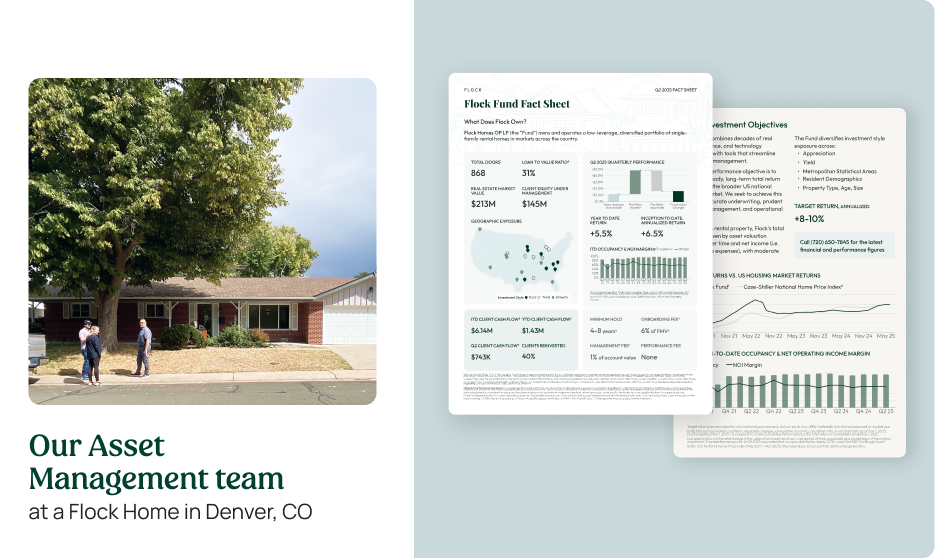 Flock’s goal is to provide fair-market valuations for all rental properties. We will only transact on homes that meet our return criteria and support the performance of the fund. Our valuations are determined through an industry-standard underwriting process, incorporating leading AVMs and market comparables, based on property characteristics such as configuration, location, and condition. We perform formal inspections on all prospective homes before finalizing our valuations.
